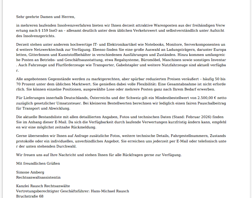 Darin werden Maschinen, technische Anlagen, Fahrzeuge sowie weitere Betriebsausstattung aus angeblich laufenden Insolvenzverfahren angeboten. Als Absender tritt eine vermeintliche „Kanzlei Rausch“ aus Düsseldorf auf.